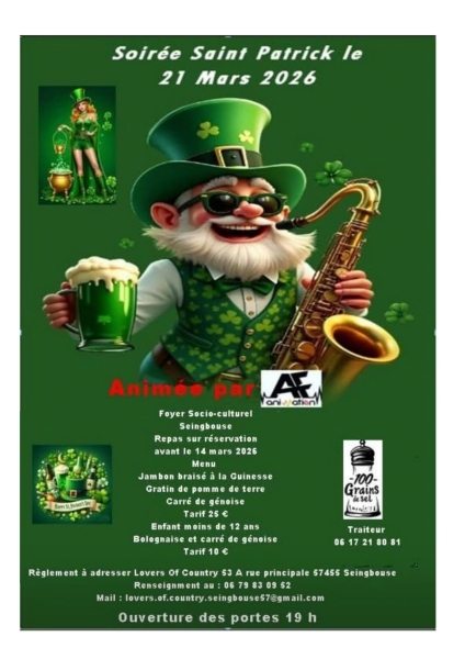 Date : Samedi 21/03/2026 Horaires : 19h Tarifs : 25€ adulte, 10€ enfant moins de 12 ans Organisateur : MUNICIPALITÉ Adresse de l'événement : FOYER SOCIOCULTUREL 36 RUE PRINCIPALE 57455 SEINGBOUSE Informations complémentaires : Animation : AE Animation. Repas sur réservation avant le 14 mars 2026. Menu : jambon braisé à la Guinness, gratin de pomme de terre, carré de génisse. Menu enfant : bolognaise et carré de génisse. Règlement à adresser à Lovers Of Country, 53 A rue Principale, 57455 Seingbouse. Ouverture des portes 19h. Danses pratiquées : Danse celtique, Danse folklorique Référence de l'annonce : 64558 call03 87 29 14 30call06 73 89 03 52