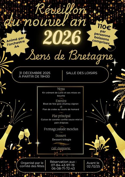 Date : Mercredi 31/12/2025 Horaires : 19h30 Tarifs : 110€ Organisateur : COMITÉ DES FÊTES Adresse de l'événement : COMITÉ DES FÊTES SALLE DE LOISIRS RUE DE LA MADELEINE 35490 SENS DE BRETAGNE Informations complémentaires : Réveillon de la St Sylvestre repas gastronomique,soupe à l'oignon soirée dansante jusqu'à l'aube