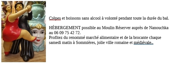 Date : Samedi 21/03/2026 Horaires : 20h Tarifs : 10€ Organisateur : NANOUCHKA Adresse de l'événement : 5B RUE ÉMILIEN DUMAS 30250 SOMMIERES Informations complémentaires : Crêpes et boissons sans alcool à volonté pendant toute la durée du bal. Hébergement possible au Moulin. Profitez du renommé marché alimentaire et de la brocante chaque samedi matin à Sommières, jolie ville romaine et médiévale. Danses pratiquées : Tango argentin Référence de l'annonce : 65889 call06 09 75 42 72