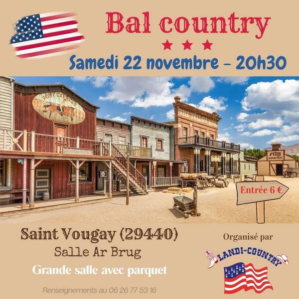 Date : Samedi 22/11/2025 Horaires : 20h30 Tarifs : Entrée 6€ Organisateur : LANDI-COUNTRY Adresse de l'événement : SALLE AR BRUG ROUTE DE PLOUESCAT 29440 ST VOUGAY Informations complémentaires : Grande salle avec parquet. Accueil dès 19h30. Danses pratiquées : Country Référence de l'annonce : 53980 call06 26 77 53 16