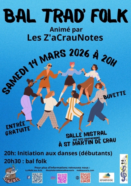 Date : Samedi 14/03/2026 Horaires : 20h à 23h Tarifs : Entrée libre Organisateur : LES ATELIERS DE LA MALLE AUX ARTS Adresse de l'événement : SALLE MISTRAL RUE DES COMPAGNONS 13310 ST MARTIN DE CRAU Informations complémentaires : Animation : Les Z?aCrauNotes. Initiation aux danses pour les débutants à 20h. Bal folk à 20h30. Buvette et vente de crêpes. Danses pratiquées : Danse folklorique Référence de l'annonce : 63979 call06 18 98 19 42