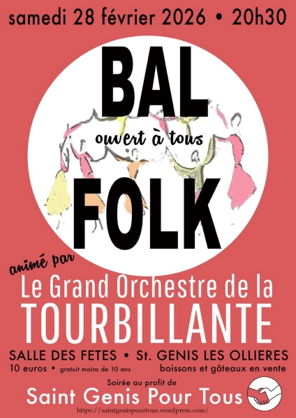Date : Samedi 28/02/2026 Horaires : 20h30 Tarifs : 10€, gratuit pour les moins de 10 ans Organisateur : ASSOCIATION SAINT GENIS POUR TOUS Adresse de l'événement : SALLE DES FÊTES PLACE DE LA MAIRIE 69290 ST GENIS LES OLLIERES Informations complémentaires : Animation : Le Grand Orchestre de la Tourbillante. Tout public. Boissons et gâteaux en vente. Soirée au profit de Saint Genis pour Tous. Danses pratiquées : Danse folklorique Référence de l'annonce : 63764 call06 10 49 61 56