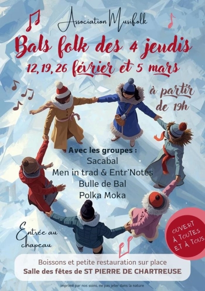 Dates : Jeudi 26/02/2026, Jeudi 05/03/2026 Horaires : 19h à 22h Tarifs : Entrée au chapeau Organisateur : ASSOCIATION MUSIFOLK Adresse de l'événement : SALLE DES FÊTES 47 PLACE DE LA MAIRIE 38380 ST PIERRE DE CHARTREUSE Informations complémentaires :