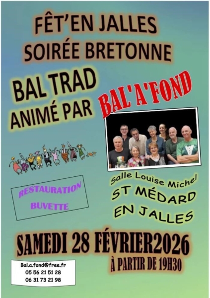 Date : Samedi 28/02/2026 Horaires : 19h30 à 23h30 Tarifs : 15€ avec menu Organisateur : COMITÉ DES FÊTES DE SAINT-MÉDARD-EN-JALLES Adresse de l'événement : SALLE LOUISE MICHEL 33160 ST MEDARD EN JALLES Informations complémentaires : Animation : BAL' A' FOND. Initiation aux danses celtiques (Bretagne, Irlande). Menu avec apéritif, crêpe salée, galette complète et crêpe sucrée. Buvette. Restauration sur place. À l'approche de la Saint-Patrick. Danses pratiquées : Danse celtique, Danse folklorique Référence de l'annonce : 62739 call05 56 21 51 28call06 31 73 21 98