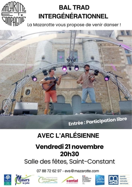 Dates : Vendredi 21/11/2025, Samedi 22/11/2025 Horaires : 20h30-22h30 Tarifs : Participation libre Organisateur : LA MAZAROTTE Adresse de l'événement : SALLE DES FÊTES 15600 ST CONSTANT FOURNOULES Informations complémentaires : Animation : L'Arlésienne. Bal intergénérationnel. Initiation aux pas de base pour débutants. Boeuf musical à 22h30 avec les musiciens et danseurs présents. Danses pratiquées : Danse folklorique Référence de l'annonce : 54432 call07 88 72 62 97