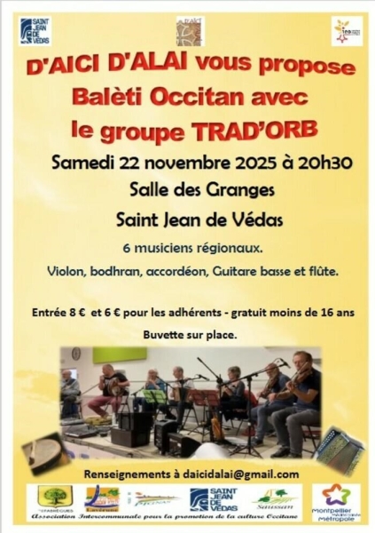 Date : Samedi 22/11/2025 Horaires : 20h30 à 23h Tarifs : 8€ adhérents 6€ gratuit moins de 16 ans Organisateur : D?AÏCI D?ALAI Adresse de l'événement : SALLE DES GRANGES RUE AUGUSTE RENOIR 34430 ST JEAN DE VEDAS Informations complémentaires : Animation : Trad' Orb. Danses trads d'Occitanie, d'Auvergne, de Bretagne, du Sud-Ouest, de Croatie, de Flandre, d'Israël et d'Italie. 6 musiciens régionaux. Instruments : flûte, bodhran, accordéon, guitare, basse, violon. Buvette sur place. Danses pratiquées : Danse folklorique Référence de l'annonce : 54480