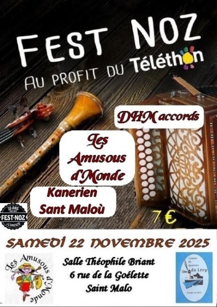 Date : Samedi 22/11/2025 Horaires : 21h à 23h55 Tarifs : 7€ Organisateur : LES AMUSOUS D'MONDE Adresse de l'événement : SALLE THÉOPHILE-BRIANT 6 RUE DE LA GOËLETTE 35400 ST MALO Informations complémentaires : Fest-Noz du Téléthon 2025 avec comme participants :
