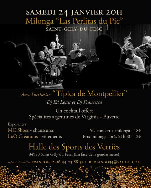 Dates : Mercredi 31/12/2025, Samedi 24/01/2026 Horaires : 20h - 0h30 Tarifs : 18€ Organisateur : LIBERTANGO Adresse de l'événement : HALLE DES SPORTS DES VERRIÈS 34980 ST GELY DU FESC Informations complémentaires : Milonga animée par l'orchestre "La Tipica De Montpellier"