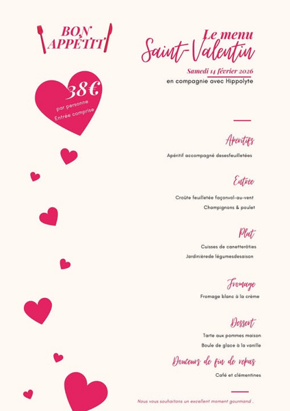 Date : Samedi 14/02/2026 Horaires : 12h Tarifs : 38€ par personne Organisateur : LE MICMAC Adresse de l'événement : LE MICMAC 94100 ST MAUR DES FOSSES Informations complémentaires : Animation : Hippolyte. Entrée comprise. Menu Saint-Valentin. Apéritif, croûte feuilletée façon vol-au-vent champignons et poulet, cuisses de canette rôties, jardinière de légumes, fromage blanc à la crème, tarte aux pommes maison, glace vanille, café et clémentines. Saint-Valentin. Danses pratiquées : Danses de salon, Danses en ligne (Line dance), Danses rétro Référence de l'annonce : 63099
