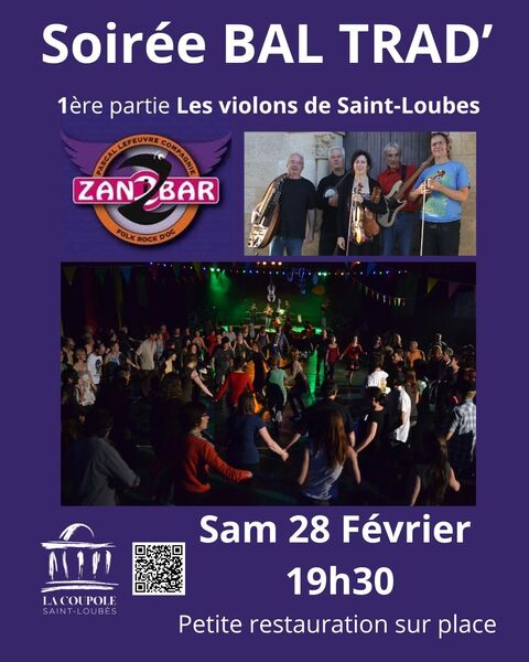 Date : Samedi 28/02/2026 Horaires : 19h30 Tarifs : tarif unique 6€ Organisateur : LA COUPOLE Adresse de l'événement : 36 CHEMIN DE NICE 33450 ST LOUBES Informations complémentaires : Bal concert ou concert dansant. Musique à danser et à écouter. Dans un bal trad' ou folk, les musiciens et danseurs évoluent dans une ambiance festive autour de musiques et danses d'origines ou d'inspiration traditionnelles, arrangées et revitalisées. Tout le monde peut s'essayer à la danse !