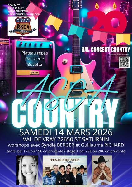Date : Samedi 14/03/2026 Tarifs : Bal 17€ ou 15€ en prévente. Stage + bal 22€ ou 20€ en prévente. Organisateur : ASCA COUNTRY Adresse de l'événement : CENTRE DU VAL DE VRAY RUE DU VAL DE VRAY 72650 ST SATURNIN Informations complémentaires : Workshops avec Syndie Berger et Guillaume Richard. Animation : Texas Sidestep. Plateau repas. Pâtisserie. Buvette. Danses pratiquées : Country, Danses de salon, Danses en ligne (Line dance), Danses rétro Référence de l'annonce : 61923 call06 15 78 01 69