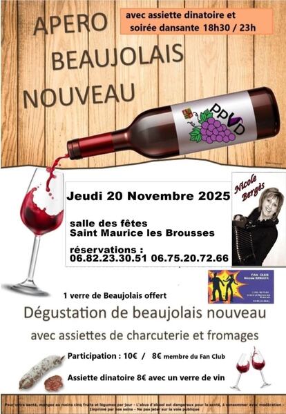 Date : Jeudi 20/11/2025 Horaires : 18h30 à 23h Tarifs : 10€ (non-membre), 8€ (membre du fan club), assiette dinatoire 8€ avec un verre de vin Adresse de l'événement : SALLE DES FÊTES 87800 ST MAURICE LES BROUSSES Informations complémentaires : Animation : Orchestre Nicole Bergès. 1 verre de Beaujolais offert. Dégustation de charcuterie et fromages. Assiette dinatoire possible sur place. Danses pratiquées : Danses de salon, Danses en ligne, Danses rétro, Variété Référence de l'annonce : 55225 call06 82 23 30 51call06 75 20 72 66