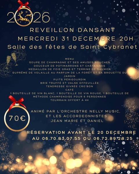 Date : Mercredi 31/12/2025 Horaires : 20h Tarifs : 70€ Adresse de l'événement : SALLE DES FÊTES DE SAINT-CYBRANET 24250 ST CYBRANET Informations complémentaires : Animation : Orchestre Nelly Music, Jean-Marie et Daniel accordéonistes, Nelly Caminade. Menu festif avec soupe de champagne, foie gras, volaille, fromages et dessert. Boissons incluses (vins et méthode champenoise). Tourrain offert à 4h. Réservation avant le 20 décembre. Danses pratiquées : Danses de salon, Danses en ligne, Danses rétro, Valse Référence de l'annonce : 57044 call06 70 83 07 55call06 72 89 28 25