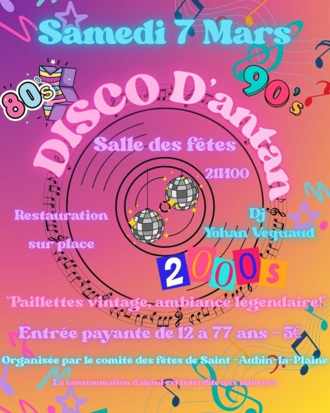 Date : Samedi 07/03/2026 Horaires : 21h à 02h Tarifs : 5€ Organisateur : COMITÉ DES FÊTES DE SAINT-AUBIN-LA-PLAINE Adresse de l'événement : ESPACE MICHEL DAUNIS RUE DU STADE 85210 ST AUBIN LA PLAINE Informations complémentaires : Animation : DJ Yohan Vegnaud. Ambiance années 80, 90, 2000. Restauration sur place. Thème : Paillettes vintage, ambiance légendaire. Entrée payante de 12 à 77 ans. Consommation d?alcool interdite aux mineurs. Danses pratiquées : Disco Référence de l'annonce : 63834 call06 63 81 96 27