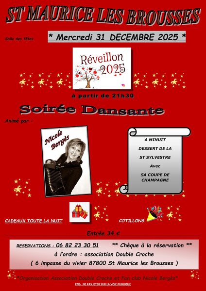 Date : Mercredi 31/12/2025 Horaires : 21h30 Tarifs : 34€ Organisateur : ASSOCIATION DOUBLE CROCHE ET FANFARE CLUB NICOLE B Adresse de l'événement : SALLE DES FÊTES 6 IMPASSE DU VIVIER 87800 ST MAURICE LES BROUSSES Informations complémentaires : Soirée dansante animée par Nicole Bergès. Danses pratiquées : Danses de salon, Danses en ligne, Danses rétro Référence de l'annonce : 55224 call06 82 23 30 51
