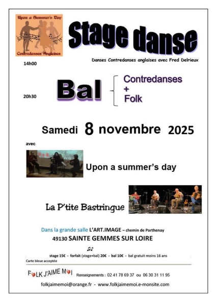 Dates : Samedi 08/11/2025, Dimanche 09/11/2025 Horaires : 14h à 18h Tarifs : Stage 15€, forfait stage + bal 20€, bal 10€, bal gratuit moins de 15 ans Organisateur : FOLK J?AIME MOI Adresse de l'événement : SALLE L'ART IMAGE CHEMIN DE PARTHENAY 49130 STE GEMMES SUR LOIRE Informations complémentaires : Animation : Fred Delrieux (stage), Upon Summer Day et La P'tite Bastringue (bal). Bal à 20h30. Carte bleue acceptée. Danses pratiquées : Danse folklorique Référence de l'annonce : 53785 call02 41 78 69 37call06 31 30 11 15
