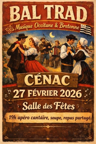 Date : Vendredi 27/02/2026 Horaires : 19h à 23h Adresse de l'événement : SALLE DES FÊTES CÉNAC 12260 STE CROIX Informations complémentaires : Musique bretonne et occitane. Apéro cantàire à 19h. Soupes. Repas partagé. Bal en soirée. Danses pratiquées : Danse folklorique Référence de l'annonce : 61613