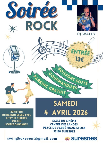 Date : Samedi 04/04/2026 Horaires : 20h15/01h Tarifs : 13 euros Organisateur : SWINGBOX Adresse de l'événement : PLACE DE L'ABBÉ FRANZ STOCK 92150 SURESNES Informations complémentaires : On vous attends nombreux le samedi 4 avril 2026 à Suresnes dans la salle du cinéma pour :