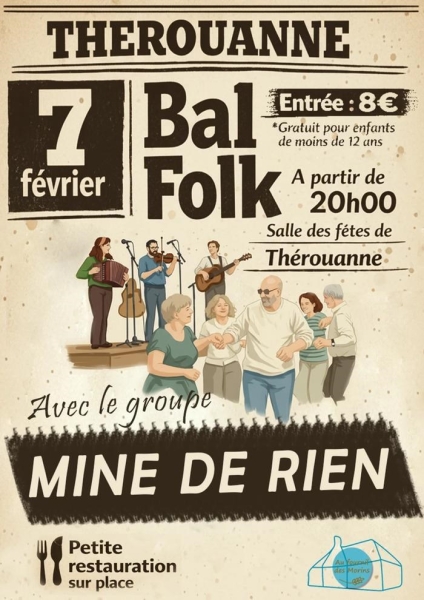 Date : Samedi 07/02/2026 Horaires : 20h Tarifs : 8€ adulte, 4€ moins de 18 ans, gratuit moins de 12 ans Organisateur : ASSOCIATION AU FOURNIL DES MORINS Adresse de l'événement : SALLE DES FÊTES 4 PLACE DE L'ÉGLISE 62129 THEROUANNE Informations complémentaires : Animation : Groupe Mine de Rien. Buvette et petite restauration sur place. Danses pratiquées : Danse folklorique Référence de l'annonce : 61352