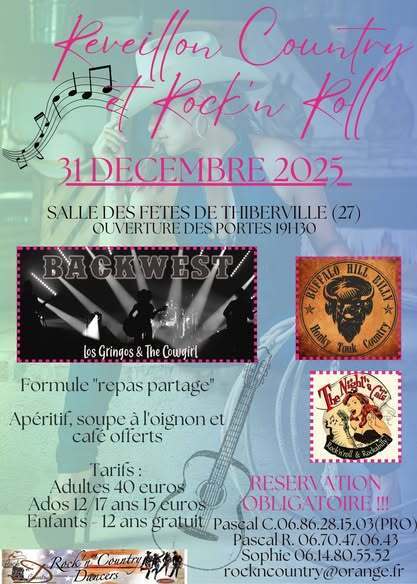 Date : Mercredi 31/12/2025 Horaires : 19h30 Tarifs : Adultes : 40€ ; Ados 12/17 ans : 15€ ; Enfants -12 ans : gratuit Organisateur : ROCK'N COUNTRY DANCERS Adresse de l'événement : SALLE DES FÊTES DE THIBERVILLE 27230 THIBERVILLE Informations complémentaires : Animation : Backwest, Los Gringos & The Cowgirl, Buffalo Hill Dancers Honky Tonk Company, The Night Riders. Formule : repas partagé (apéritif, soupe à l'oignon et café offerts). Réservation obligatoire. Ouverture des portes 19h30. Danses pratiquées : Country, Rock Référence de l'annonce : 50212 call06 86 28 15 03call06 70 47 06 43