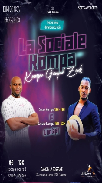 Date : Dimanche 08/03/2026 Horaires : 18h à 22h Tarifs : Sociale Kompa 8€ ; Cours + Sociale 12€ Organisateur : SAK PASÉ Adresse de l'événement : DANC'IN LA ROSERAIE 135 AVENUE DE LAVAUR 31000 TOULOUSE Informations complémentaires : Animation : FX et DJ Bon Bagay. Ambiance 100 % Kompa, Gouyad, Zouk. Sol en parquet, climatisation, sono et jeux de lumière. Softs à volonté. Vestiaire à disposition. Paiement espèces ou CB. Danses pratiquées : Danses de salon, Danses en ligne (Line dance), Danses rétro, Zouk Référence de l'annonce : 58591 call07 68 23 23 69