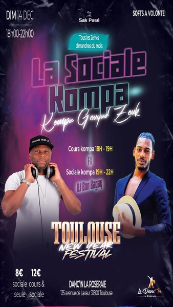 Date : Dimanche 14/12/2025 Horaires : 18h - 22h Tarifs : 12€ Organisateur : SAK PASE EVENT Adresse de l'événement : 135 AVENUE DE LAVAUR 31500 TOULOUSE Informations complémentaires : Sak Pasé vous présente sa mensuelle Kompa