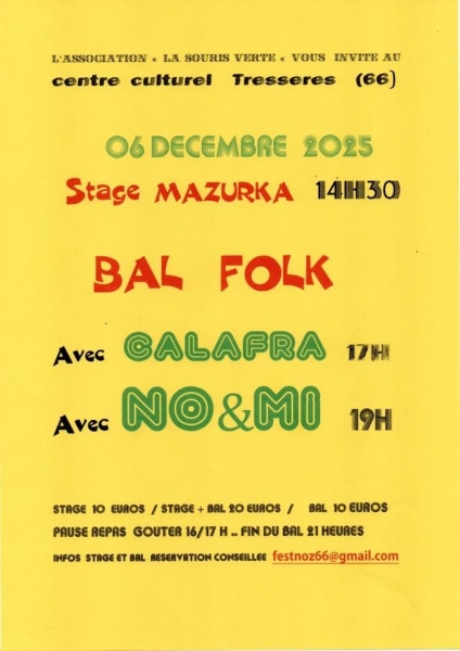 Date : Samedi 06/12/2025 Horaires : 13h30 à 21h15 Tarifs : Stage 10€ / Stage + Bal 20€ / Bal seul 10€ Organisateur : ASSOCIATION LA SOURIS VERTE Adresse de l'événement : CENTRE CULTUREL TRESSERRES 66300 TRESSERRE Informations complémentaires : Stage mazurka 14hr 30 jusque 16 hrs