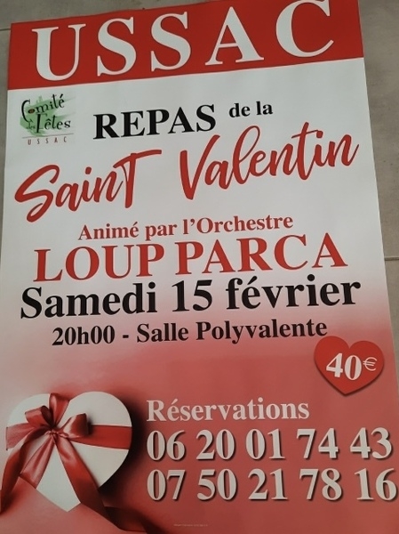 Date : Dimanche 15/02/2026 Horaires : 20h Tarifs : 40€ Organisateur : COMITÉ DES FÊTES USSAC Adresse de l'événement : SALLE POLYVALENTE 19270 USSAC Informations complémentaires : Animation : Orchestre Loup Parca. Repas de la Saint-Valentin. Danses pratiquées : Danses de salon, Danses en ligne (Line dance), Danses rétro Référence de l'annonce : 61994 call06 20 01 74 43call07 50 21 78 16