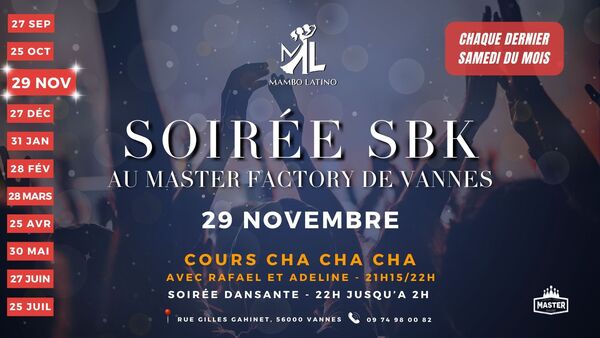 Dates : Samedi 31/01/2026, Samedi 28/02/2026, Samedi 28/03/2026, Samedi 25/04/2026, Samedi 30/05/2026 (2 autres dates), Samedi 27/06/2026, Samedi 25/07/2026 Horaires : 21h15 à 2h Tarifs : Gratuit (consommation de courtoisie conseillée) Organisateur : MAMBO LATINO Adresse de l'événement : MASTER FACTORY 1 RUE GILLES-GAHINET 56000 VANNES Danses pratiquées : Bachata, Cha cha cha, Danses latino, Kizomba, Mambo, Salsa Référence de l'annonce : 56373 call09 74 98 00 82