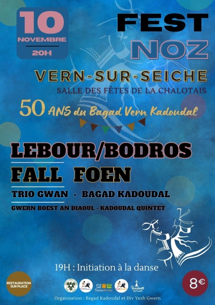 Date : Lundi 10/11/2025 Horaires : 19h à 01h30 Tarifs : 8€ Organisateur : BAGAD KADOUDAL ET DIV YEZH GWERN Adresse de l'événement : SALLE DES FÊTES DE LA CHALOTAIS ALLÉE DE LA CHALOTAIS 35770 VERN SUR SEICHE Informations complémentaires : Animation : Le Bour-Bodros, Fall Foen, Trio Gwan, Bagad Kadoudal, Gwern Boest an Diaoul, Kadoudal Quintet. Initiation à la danse à 19h comprise dans le tarif. Restauration sur place (galettes saucisses, crêpes, gâteaux, boissons). 50 ans du Bagad Kadoudal. Collaboration avec Div Yezh Gwern, Div Yezh Breizh et Skeudenn Bro Roazhon. Danses pratiquées : Danse bretonne Référence de l'annonce : 54733