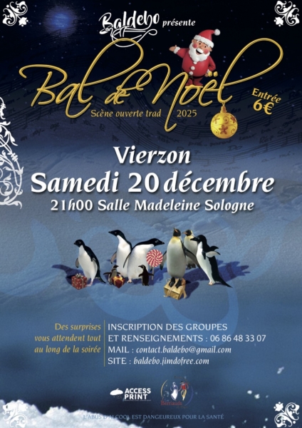 Date : Samedi 20/12/2025 Horaires : 21h Tarifs : 6€ Organisateur : BALDÉBO Adresse de l'événement : SALLE MADELEINE SOLOGNE RUE MIRANDA DE EBRO 18100 VIERZON Informations complémentaires : Scène ouverte trad. 5 groupes, 5 ambiances. Des surprises tout au long de la soirée. Soirée conviviale pour bien lancer les fêtes. Inscription des groupes ouverte. Danses pratiquées : Danse folklorique Référence de l'annonce : 55597 call06 86 48 33 07