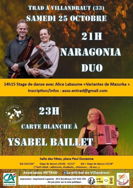 1ère partie : NARAGONIA (duo) 2ème partie :carte blanche à Ysabel BAILLET et ses invités Danses pratiquées : Danse folklorique Référence de l'annonce : 52272