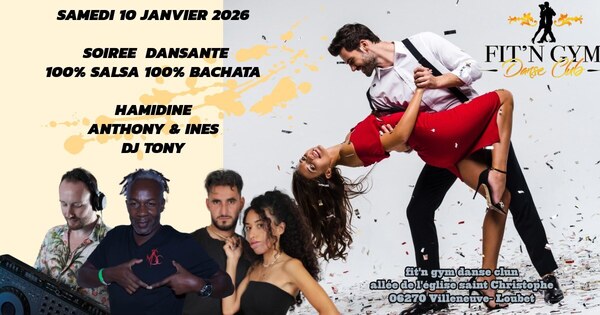 Date : Samedi 10/01/2026 Horaires : 20h-03h Tarifs : 2 cours + soirée 20€ ; soirée seule (softs inclus) 15€ Organisateur : FIT'N GYM DANSE CLUB Adresse de l'événement : FIT'N GYM DANSE CLUB 06270 VILLENEUVE LOUBET Informations complémentaires : Animation : DJ Signore Tony. Avec Hamidine, Anthony et Ines. Salle 1 : Salsa évolutive et Salsa intermédiaire/avancés. Salle 2 : Bachata influence. Boissons softs à volonté. Inscription au groupe WhatsApp Fit'n Gym Danse Club (communication uniquement). Danses pratiquées : Bachata, Salsa Référence de l'annonce : 61089