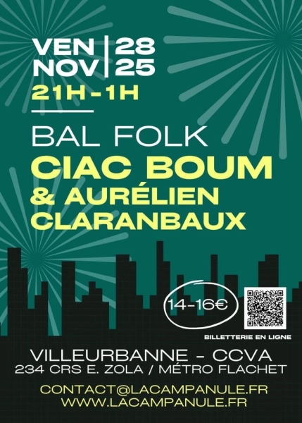 Dates : Vendredi 28/11/2025, Samedi 29/11/2025 Horaires : 21h-1h Tarifs : 14€-16€ / gratuit -14 ans Organisateur : LA CAMPANULE Adresse de l'événement : CCVA 234 COURS ÉMILE-ZOLA 69100 VILLEURBANNE Informations complémentaires : BAL FOLK avec CIAC BOUM & AURELIEN CLARANBAUX SOLO Danses pratiquées : Danse folklorique Référence de l'annonce : 54923 call06 09 14 37 25