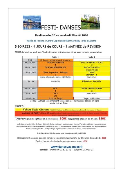 Dates : Dimanche 23/08/2026, Lundi 24/08/2026, Mardi 25/08/2026, Mercredi 26/08/2026, Jeudi 27/08/2026 (1 autre date), Vendredi 28/08/2026 Horaires : de 8h40 à 19h Tarifs : de 300 à 350€/ Organisateur : DANSE ACADEMIE DE LA VALSERINE Adresse de l'événement : 1 RUE DE L'ORME CENTRE CAP FRANCE 89500 ARMEAU Informations complémentaires : Hébergement 490€ Danses pratiquées : Bachata, Kizomba, Rock, Salsa cubaine, Tango argentin, Valse argentine, West Coast Swing Référence de l'annonce : 54606 call06 11 67 97 72call06 12 79 35 17