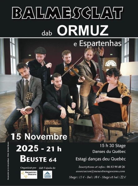 Date : 15/11/2025 (Événement passé) Horaires : 15h30 et 21h Tarifs : Stage 15€ - Bal 10€ - Stage et bal 22€ Organisateur : RENCONTRAS GASCONAS Adresse de l'événement : SALLE DES FÊTES 64800 BEUSTE Informations complémentaires : Animation : Ormuz et Espartenhas. Stage de danses du Québec (sets carrés et contredanses). Bal à 21h. Nombre de places limité. Réservation conseillée. Danses pratiquées : Danse folklorique Référence de l'annonce : 54323 call06 83 98 40 26