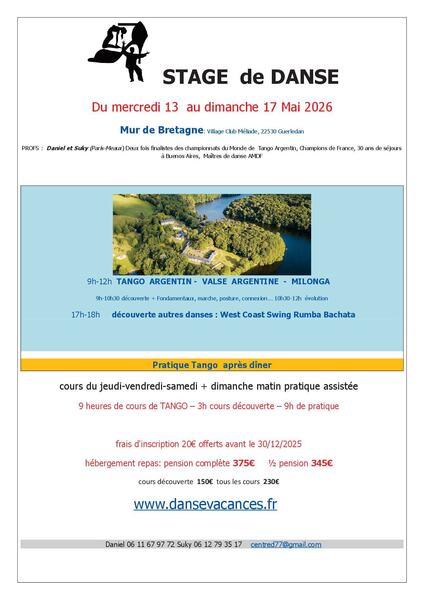 Dates : Mercredi 13/05/2026, Jeudi 14/05/2026, Vendredi 15/05/2026, Samedi 16/05/2026, Dimanche 17/05/2026 Horaires : de 9 à 18h Tarifs : de 150 à 350€ Organisateur : DANSE ACADEMIE DE LA VALSERINE Adresse de l'événement : VILLAGE CLUB MÉLIADE 22530 GUERLEDAN Informations complémentaires : Hébergement de345 à 375€ Danses pratiquées : Bachata, Rumba, Tango argentin, Valse anglaise, West Coast Swing Référence de l'annonce : 54595 call06 11 67 97 72call06 12 79 35 17