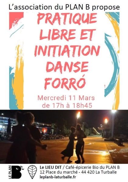 Date : Mercredi 11/03/2026 Horaires : 17h à 18h45 Tarifs : Participation libre Organisateur : ASSOCIATION DU PLAN B Adresse de l'événement : LE LIEU-DIT CAFÉ-ÉPICERIE BIO DU PLAN B 12 PLACE DU MARCHÉ 44420 LA TURBALLE Informations complémentaires : Ouvert à toutes et à tous. Consommation de courtoisie appréciée au Café-bar Bio du Plan B. Playlist musicale Forró (Luis Gonzaga, Dominguinhos, etc.). Autres dates d'ateliers : 11/02, 15/04, 06/05, 17/06 à 17h. Danses pratiquées : Danses de salon, Danses en ligne (Line dance), Danses rétro, Forró Référence de l'annonce : 64463 call09 72 66 30 12