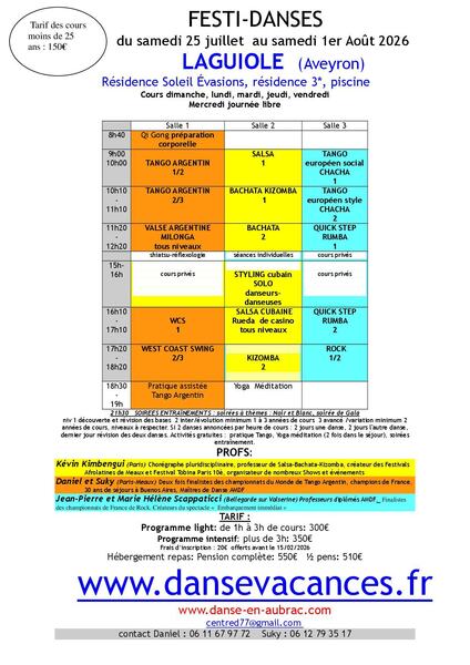 Dates : Samedi 25/07/2026, Dimanche 26/07/2026, Lundi 27/07/2026, Mardi 28/07/2026, Mercredi 29/07/2026 (3 autres dates), Jeudi 30/07/2026, Vendredi 31/07/2026, Samedi 01/08/2026 Horaires : de 8h40 à 19h Tarifs : de 150 à 350€ Organisateur : DANSE ACADEMIE DE LA VALSERINE Adresse de l'événement : RÉSIDENSE SOLEIL EVASION 12210 LAGUIOLE Danses pratiquées : Bachata, Quickstep, Rock, Rumba, Salsa, Salsa cubaine, Tango, Tango argentin, Valse argentine, West Coast Swing Référence de l'annonce : 54590 call04 50 59 94 27call06 09 84 02 33