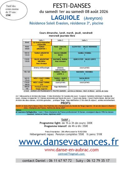 Dates : Samedi 01/08/2026, Dimanche 02/08/2026, Lundi 03/08/2026, Mardi 04/08/2026, Mercredi 05/08/2026 (3 autres dates), Jeudi 06/08/2026, Vendredi 07/08/2026, Samedi 08/08/2026 Horaires : de 8h40 à 19h Tarifs : de 300 à 350€/ Organisateur : DANSE ACADEMIE DE LA VALSERINE Adresse de l'événement : RÉSIDENSE SOLEIL EVASION 12210 LAGUIOLE Informations complémentaires : Hébergement 510 0 550€ Danses pratiquées : Bachata, Cha cha cha, Kizomba, Paso-doble, Quickstep, Rock, Rumba, Salsa, Salsa cubaine, Samba, Slowfox, Tango, Tango argentin, Valse anglaise, Valse argentine, Valse viennoise, West Coast Swing Référence de l'annonce : 54596 call06 11 67 97 72call06 12 79 35 17