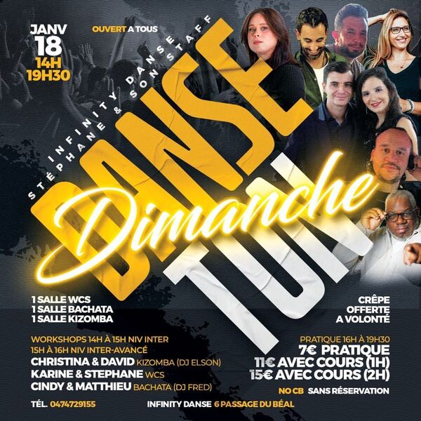 Date : Dimanche 18/01/2026 Horaires : 14h à 19h30 Tarifs : 2 cours + pratique : 15€ / 1 cours + pratique : 11€ / pratique seule : 7€ Organisateur : INFINITY DANSE Adresse de l'événement : INFINITY DANSE 6 PASSAGE DU BÉAL 69009 LYON 09 Informations complémentaires : 14h-16h : workshops (niveau intermédiaire et intermédiaire/avancé)