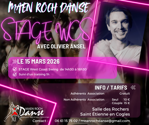 Dates : Dimanche 08/03/2026, Dimanche 15/03/2026, Dimanche 22/03/2026, Dimanche 29/03/2026 Horaires : 14h15-17h30 Tarifs : Solo : 10€ / Couple : 15€ Organisateur : OLIVIER ANSEL COURS DE DANSE Adresse de l'événement : 2 RUE DES ROCHERS 35460 MAEN ROCH Informations complémentaires : Olivier Ansel Cours de Danse va travailler en collaboration avec l'association MAEN ROCH DANSE pour 4 stages de la saison 2025 2026 :