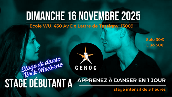 Date : Dimanche 16/11/2025 Horaires : 15h-18h Tarifs : 30€ Organisateur : CEROC FRANCE Adresse de l'événement : ECOLE WU, 430 AVENUE DE LATTRE DE TASSIGNY 13009 MARSEILLE 09 Informations complémentaires : STAGE DÉBUTANT avec lisy-pour ceux qui débutent en danse à 2