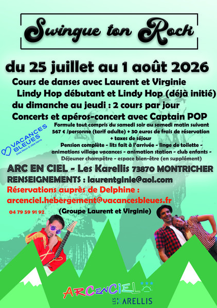 Dates : Dimanche 26/07/2026, Lundi 27/07/2026, Mardi 28/07/2026, Mercredi 29/07/2026, Jeudi 30/07/2026 Horaires : 2 cours par jour 1 cours débutant, 1 cours déjà initié Tarifs : 567 euros en pension complète + 30 euros de frais de dossier + taxe séjour Organisateur : SWINGUMS Adresse de l'événement : ARC EN CIEL, VILLAGE VACANCES KARELLIS 73870 MONTRICHER ALBANNE Informations complémentaires : Swingue ton rock 4.