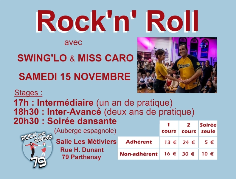 Date : Samedi 15/11/2025 Horaires : 17h à 20h30 puis soirée Tarifs : Adhérent : 13€ 1 cours, 24€ 2 cours, 5€ soirée seule. Non-adhérent : 16€ 1 cours Organisateur : ROCK AND SWING 79 Adresse de l'événement : SALLE DES MÉTIVIERS 41 RUE HENRI DUNANT 79200 PARTHENAY Informations complémentaires : Stages de Rock avec Swing'Lo et Miss Caro suivis d'une soirée dansante avec auberge Danses pratiquées : Rock, Swing Référence de l'annonce : 54295 call06 89 52 88 48