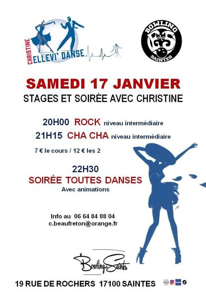 Date : Samedi 17/01/2026 Horaires : 20h à 22h30 Tarifs : 7€ le cours, 12€ les deux cours Organisateur : CHRISTINE-ELLEVI' DANSE Adresse de l'événement : BOWLING DE SAINTES 19 RUE DE ROCHERS 17100 SAINTES Informations complémentaires : À partir de 22h30 : soirée toutes danses avec animations. Danses pratiquées : Danses de salon, Danses latino, Rock Référence de l'annonce : 61176 call06 64 84 88 04