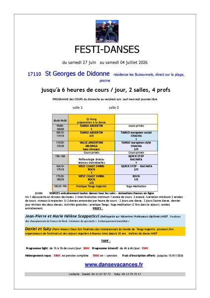 Dates : Samedi 27/06/2026, Dimanche 28/06/2026, Lundi 29/06/2026, Mardi 30/06/2026, Mercredi 01/07/2026 (3 autres dates), Jeudi 02/07/2026, Vendredi 03/07/2026, Samedi 04/07/2026 Horaires : de 8h40 à 19h Tarifs : de 300 à 350€/ Organisateur : DANSE ACADEMIE DE LA VALSERINE Adresse de l'événement : RÉSIDENSE LES BUISSONNETS 17110 ST GEORGES DE DIDONNE Informations complémentaires : Hébergement 550 à 580€ Danses pratiquées : Bachata, Cha cha cha, Danses de salon, Quickstep, Rock, Tango, Tango argentin, Valse argentine, West Coast Swing Référence de l'annonce : 54621 call04 50 59 94 27call06 09 84 02 33