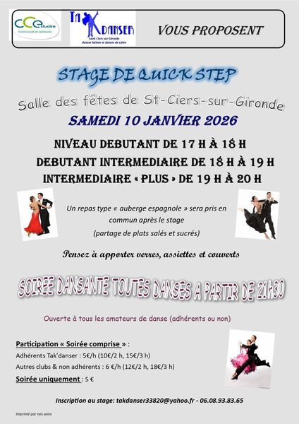 Date : Samedi 10/01/2026 Horaires : 17h à 20h (stage), 21h30 (soirée) Tarifs : Adhérents Tak'danser : 5€/h (10€/2 h, 15€/3 h). Autres clubs et non-adhérents : 6&eur Organisateur : TAK'DANSER Adresse de l'événement : SALLE DES FÊTES 33820 ST CIERS SUR GIRONDE Informations complémentaires : Repas type auberge espagnole après le stage (partage de plats salés et sucrés). Apporter verres, assiettes et couverts. Soirée dansante toutes danses ouverte à tous les amateurs de danse, adhérents ou non. Danses pratiquées : Danses de salon, Danses latino, Rock Référence de l'annonce : 61115 call06 08 93 83 65