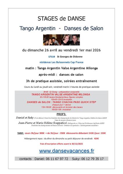 Dates : Dimanche 26/04/2026, Lundi 27/04/2026, Mardi 28/04/2026, Mercredi 29/04/2026, Jeudi 30/04/2026 (1 autre date), Vendredi 01/05/2026 Horaires : 9h à 18h Tarifs : de 150 à 350€ Organisateur : DANSE ACADEMIE DE LA VALSERINE Adresse de l'événement : CAP FRANCE 17110 ST GEORGES DE DIDONNE Informations complémentaires : Professionnels diplômés AMDF Danses pratiquées : Cha cha cha, Danses de salon, Paso-doble, Quickstep, Tango, Tango argentin, Valse argentine Référence de l'annonce : 63660 call04 50 59 94 27call06 09 84 02 33