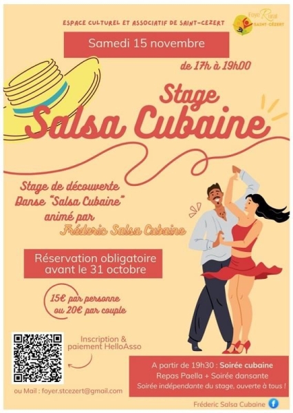 Date : Samedi 15/11/2025 Horaires : 17h à 19h Tarifs : 15€ par personne ou 20€ par couple Organisateur : ESPACE CULTUREL ET ASSOCIATIF DE SAINT-CÉZERT Adresse de l'événement : SALLE DES FÊTES 31330 ST CEZERT Informations complémentaires : Animation : Frédéric Salsa Cubaine. Réservation obligatoire avant le 31 octobre. Inscription et paiement via HelloAsso ou par mail. À partir de 19h30 : soirée cubaine avec repas paëlla et soirée dansante ouverte à tous. Entrée libre pour la soirée (hors repas). Buvette sur place. Danses pratiquées : Danses latino, Salsa, Salsa cubaine Référence de l'annonce : 54298